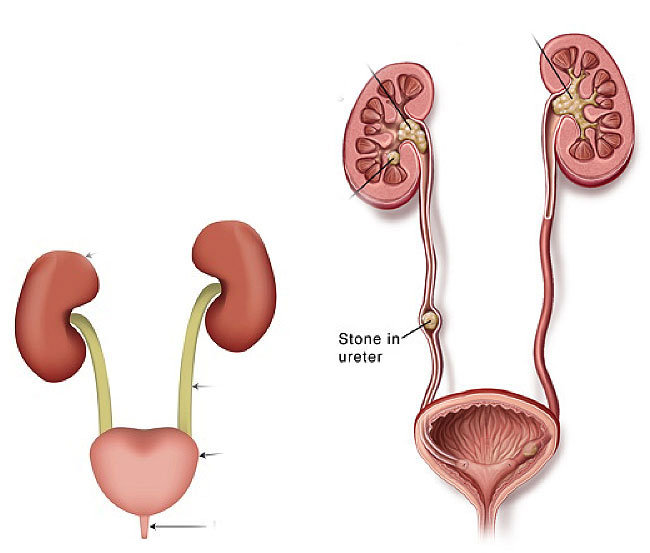 If stone moves from kidney to ureter ( the tube that passes from kidney to urinary bladder ) , thereby blocking the urine flow , so urine collect inside the kidney, then kidney get swollen which leads to classical severe pain of stone which doctors call it as ureteric colic .